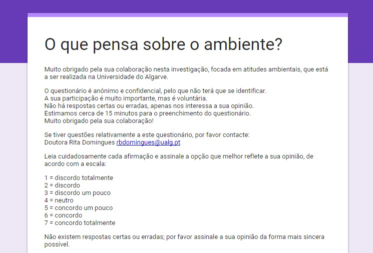 EliminarO questionário pretende estudar as atitudes ambientais. Este questionário não foi desenvolvido por nós, mas sim noutros países, em outras línguas, onde já está validado, ou seja, ele mede aquilo que é suposto medir. Nós estamos a fazer a validação para português.