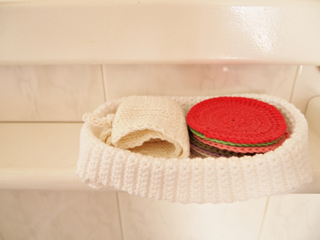 Yesterday I got a set of seven facial scrubbies, a headband and a laundry net, all beautifully organized in a small basket that fits my small bathroom shelf. Lovely, indeed, don't you agree?