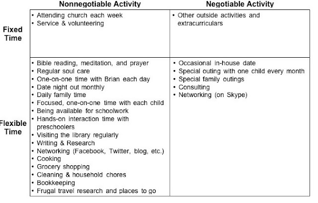 Em terceiro lugar, devemos separar as várias actividades em não negociáveis (aquelas que temos ou queremos mesmo fazer) e negociáveis (aquelas que podem ser eliminadas se não houver tempo para elas), e classificá-las consoante o horário em que devem ser feitas, ou seja, horário fixo (ex., trabalho, aulas de ginásio) ou horário flexível (ex., relaxar, ler, escrever, tratar da casa).